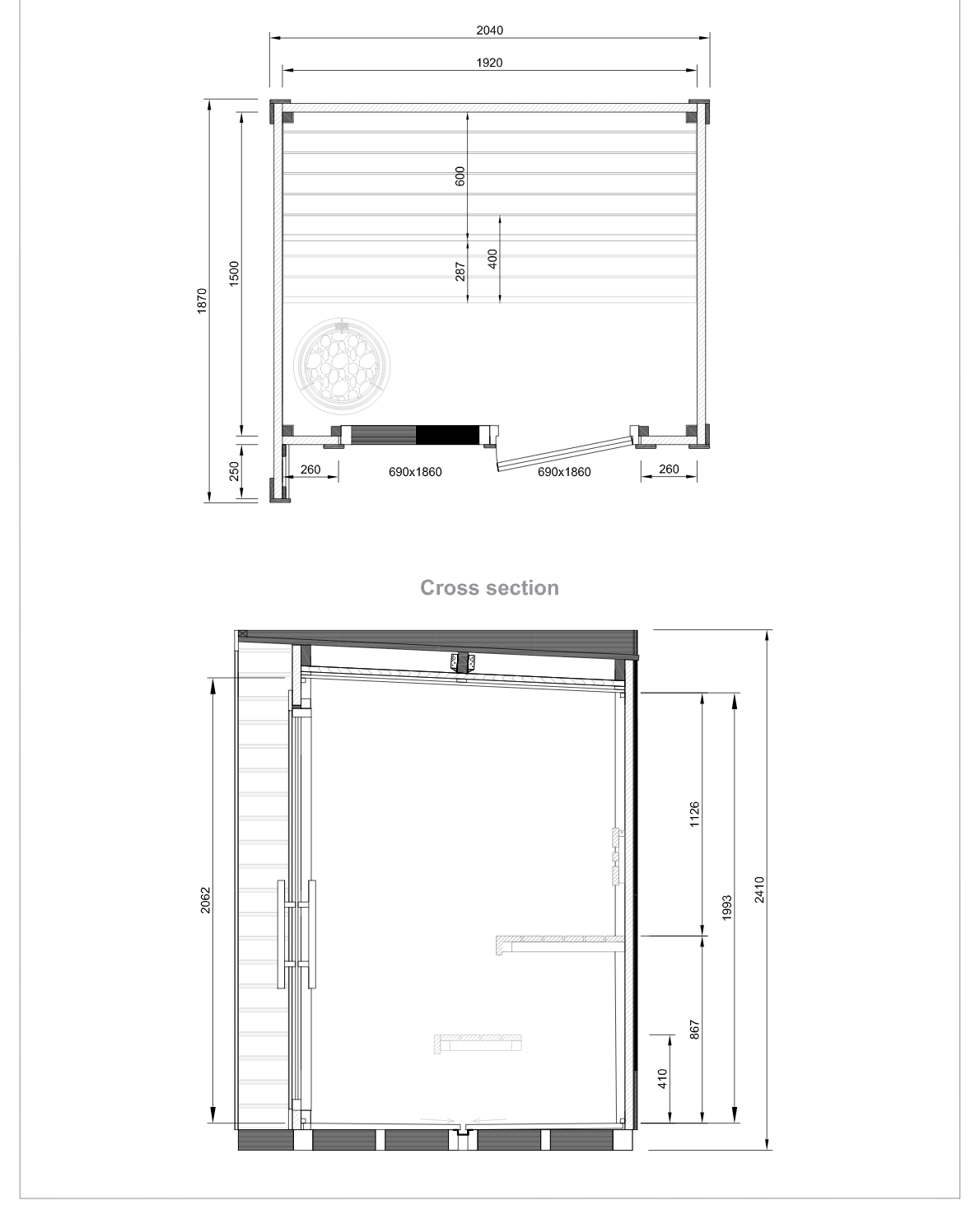 | Longueur de la salle de sauna | 200 x 200 cm à l'extérieur 192 x 192 cm à l'intérieur |