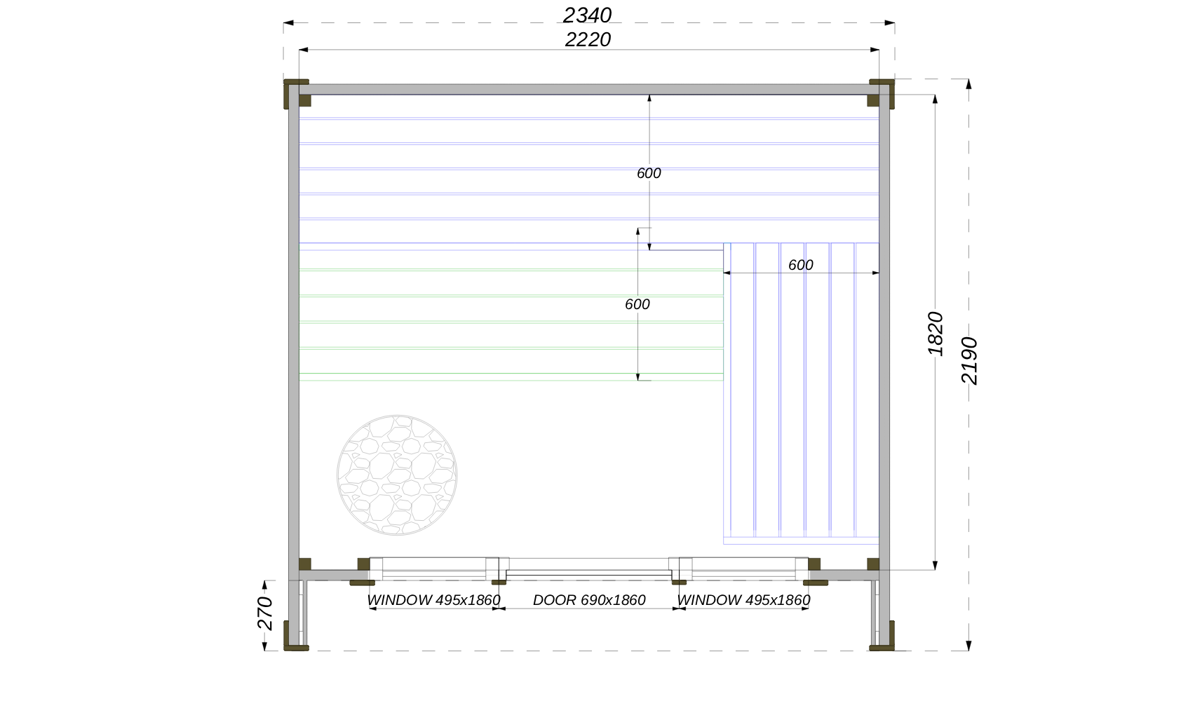 | Longueur de la salle de sauna | banc supérieur 222 cm x 60 cm + banc d'angle118cm x 60 cm - banc inférieur 222 cm x 60 cm |