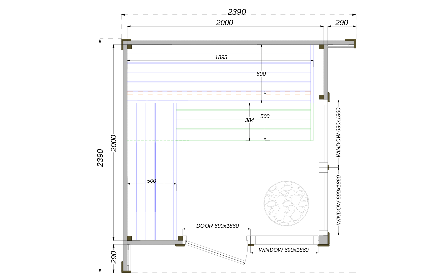 - Fourni complet avec une feuille EPDM noire avec adhésif associé, matériel de montage, banc(s) de sauna et platelage de sol.