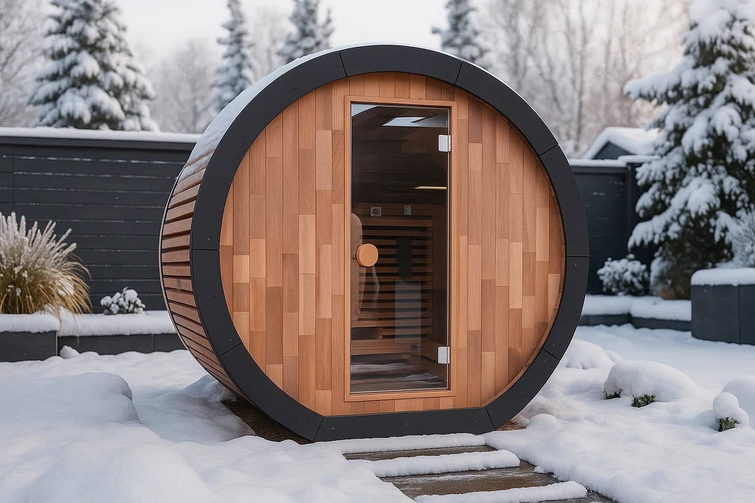 Le bois de cèdre rouge est le choix par excellence pour les saunas extérieurs, grâce à sa durabilité naturelle et ses propriétés isolantes. Il résiste à l'humidité, à la moisissure et aux variations de température, tout en diffusant un parfum chaleureux et en offrant une surface confortable qui renforce l'expérience bien-être. Ce sauna tonneau est en outre entièrement recouvert d'une membrane de toiture en EPDM, ce qui le rend presque sans entretien et lui assure une protection durable contre toutes les conditions météorologiques.